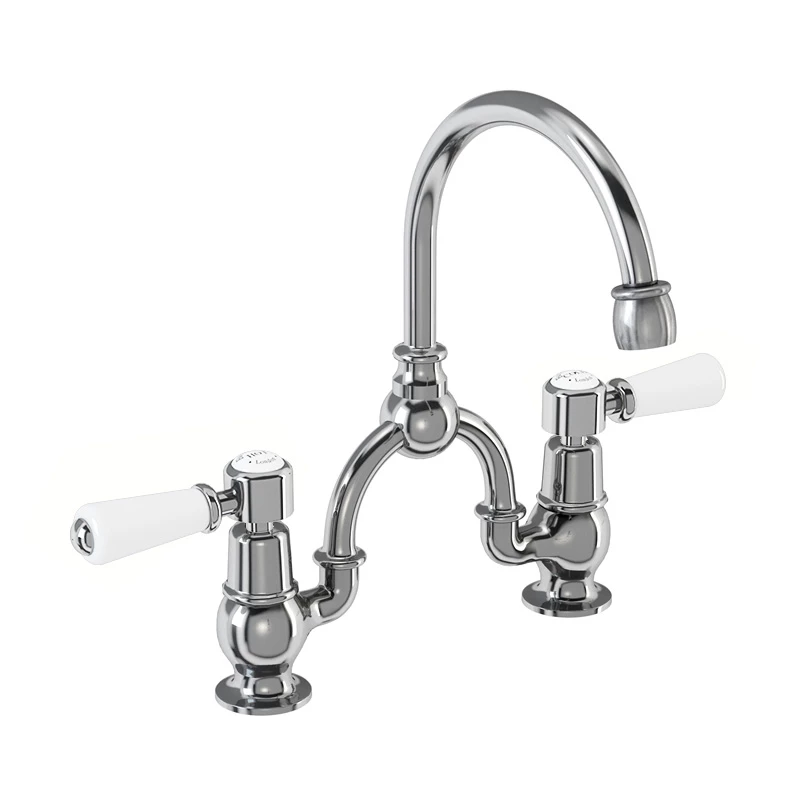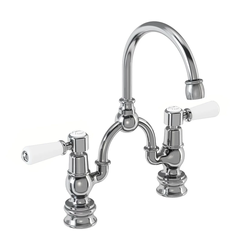 Arguably the most regal and stunning tap within the Kensington range, this Arch Basin Mixer combines intricate detailing with a wonderfully curved spout to create a traditional tap to remember. The body is crafted from the finest solid brass, accented with white ceramic tap levers and indice, and finished in a stylish polished chrome. Despite the period design this mixer is packed full of contemporary technology. Ceramic disc cartridges control the water flow and temperature with a simple quarter-turn of the handle, and a Neopearl flow straightener and aerator is supplied with it to ensure you get a consistent, steady stream of water with every use.