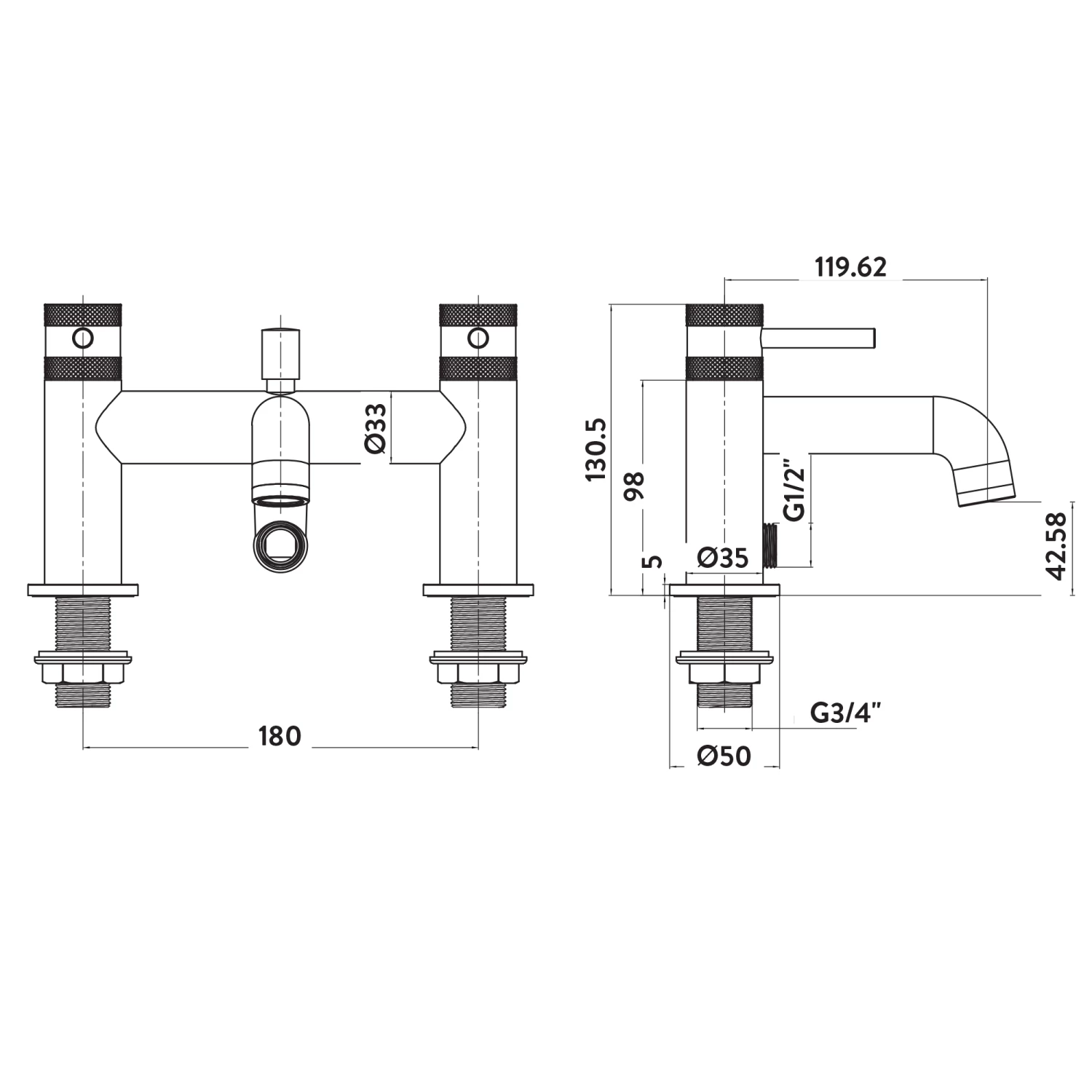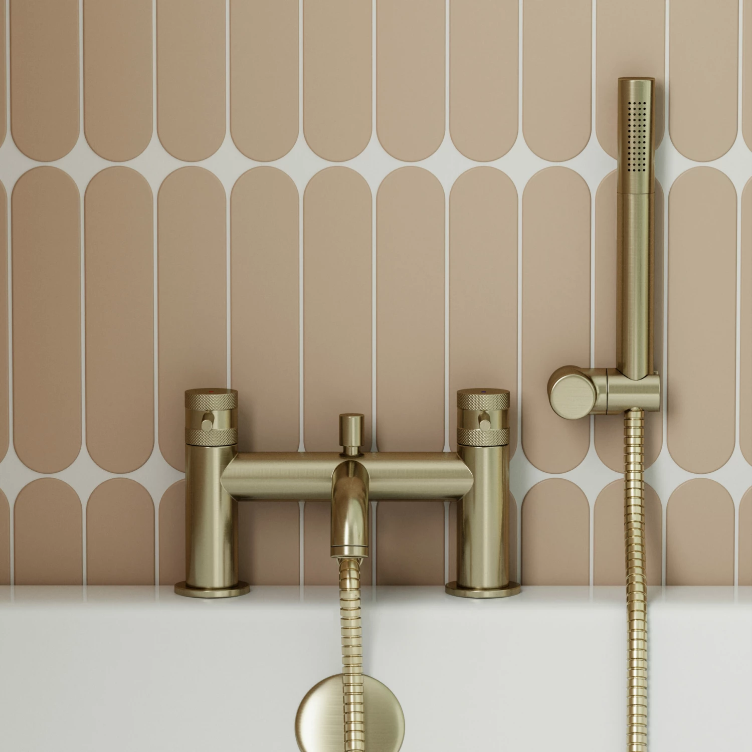 - Modern deck mounted bath shower mixer available in 3 striking finishes: Chrome, Matt Black or Brushed Brass