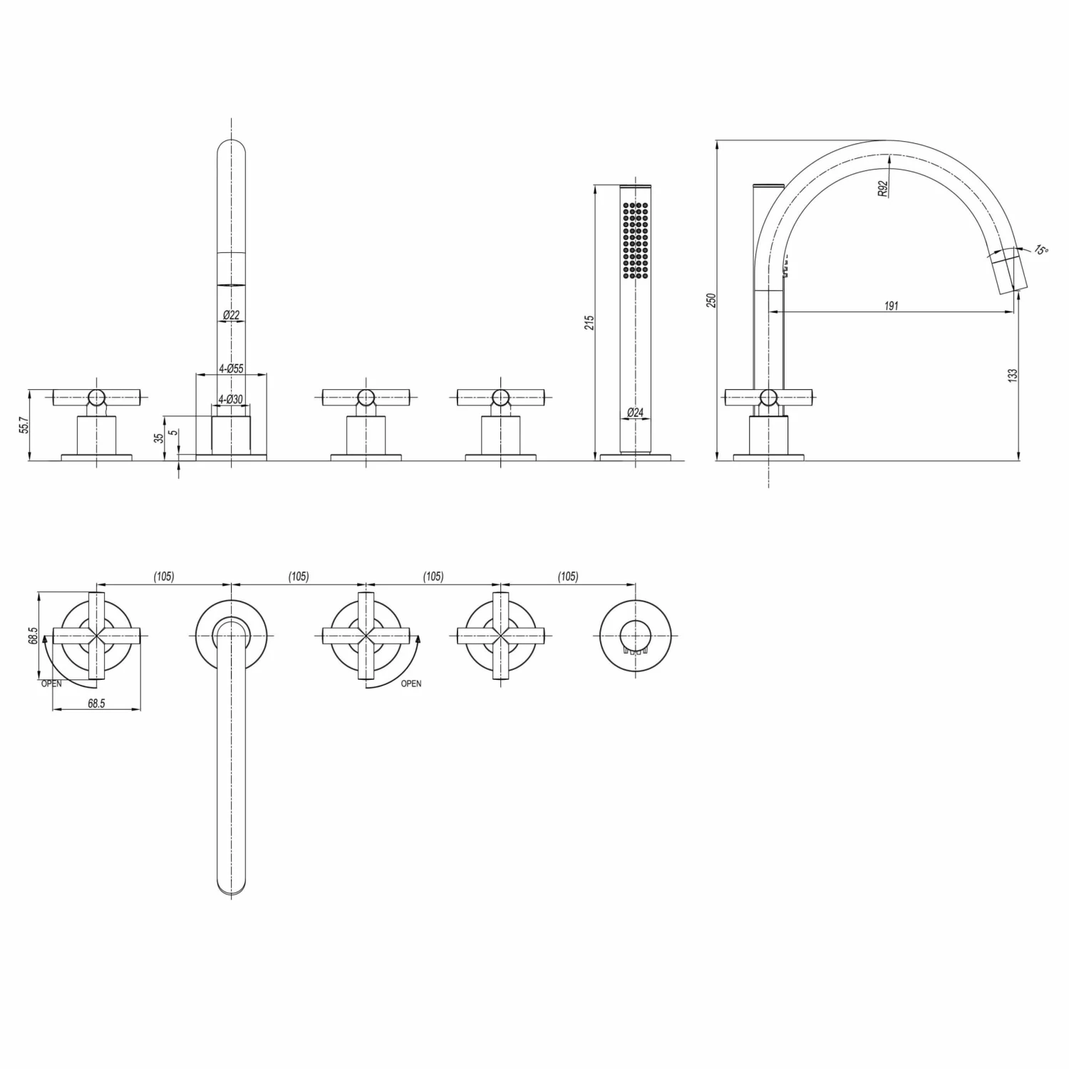 - Separate handles to adjust the hot and cold water with another handle to divert water to the shower handset