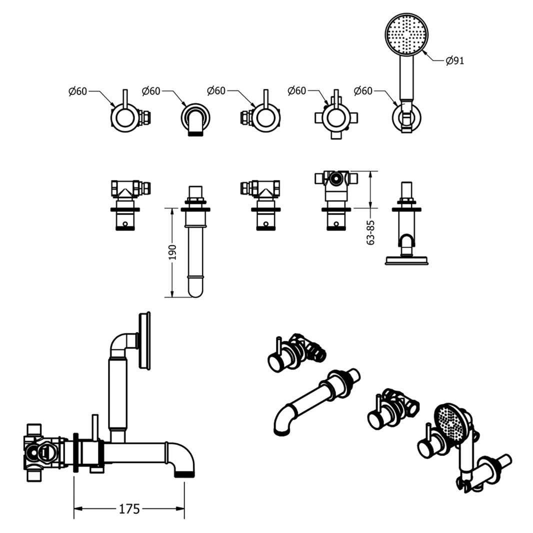 - Wall mounted 5 hole bath filler set with bath spout, shower handset, hose, wall mounting bracket & integrated wall outlet