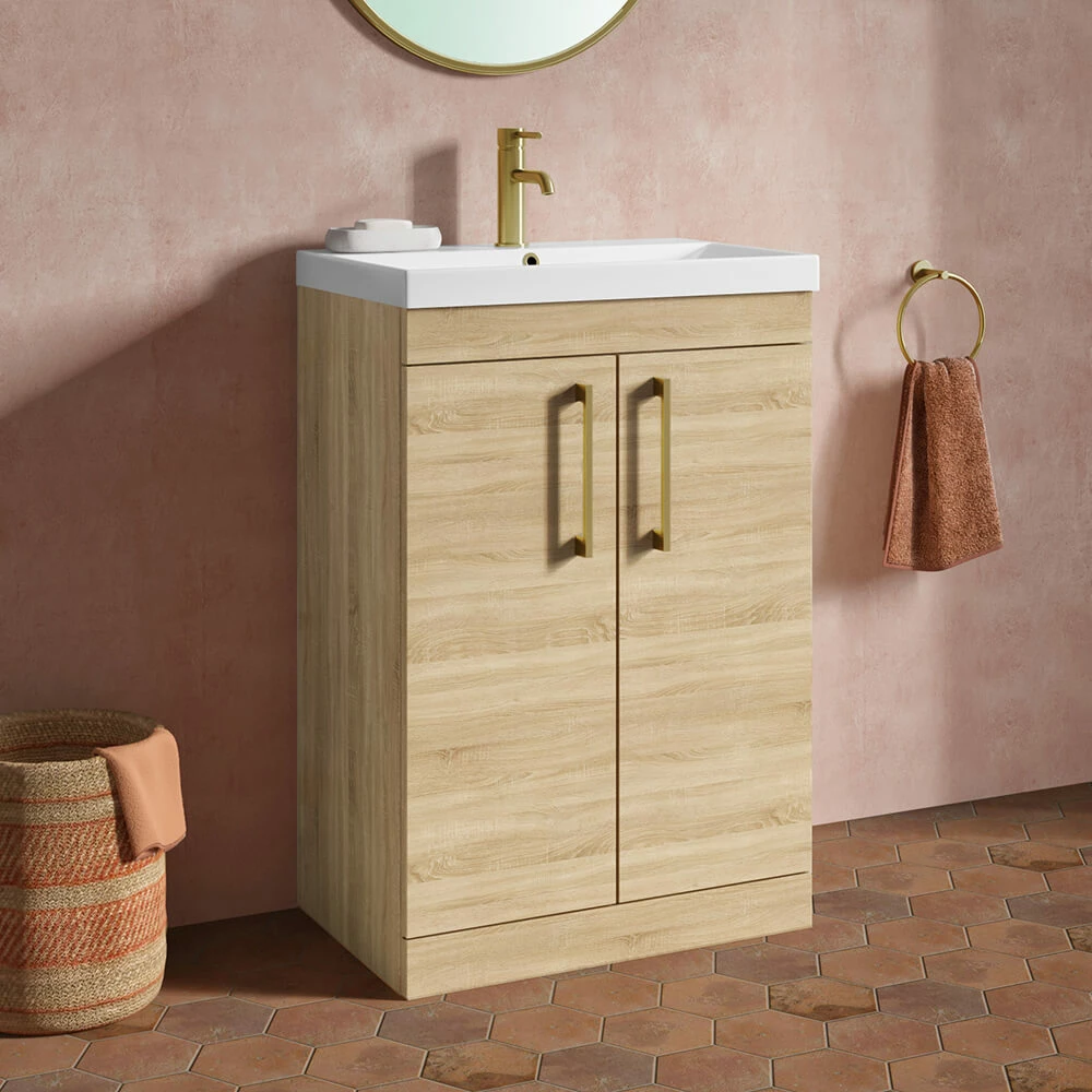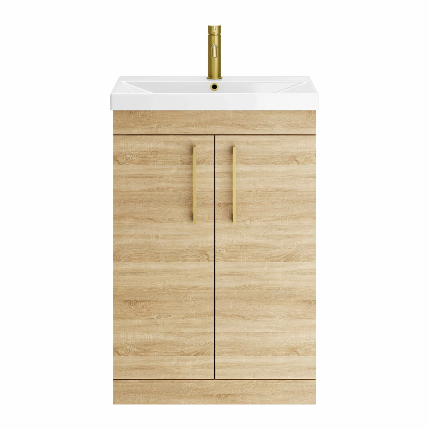 - Classic natural oak finish with striking brushed brass handles and overflow cover cap