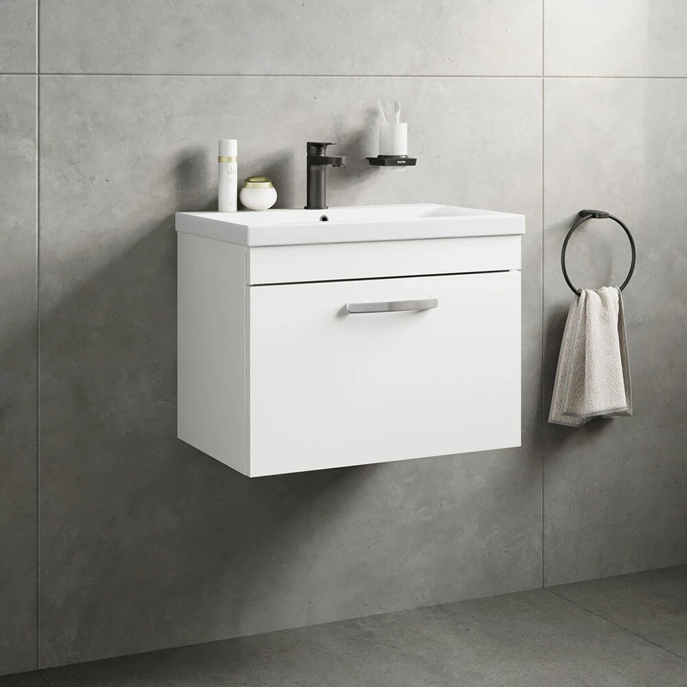 Boasting a stunning angular design and durable FSC certified wood, the Emily wall mounted single drawer vanity unit and basin brings luxury and class to all bathrooms. With soft close drawers offering extra storage space and reducing wear & tear and unwanted noise, you’ll be thrilled with this stylish addition to your home. Wall mounted to create the illusion of a more spacious bathroom and with a captivating hacienda black finish, this Emily unit will never disappoint.