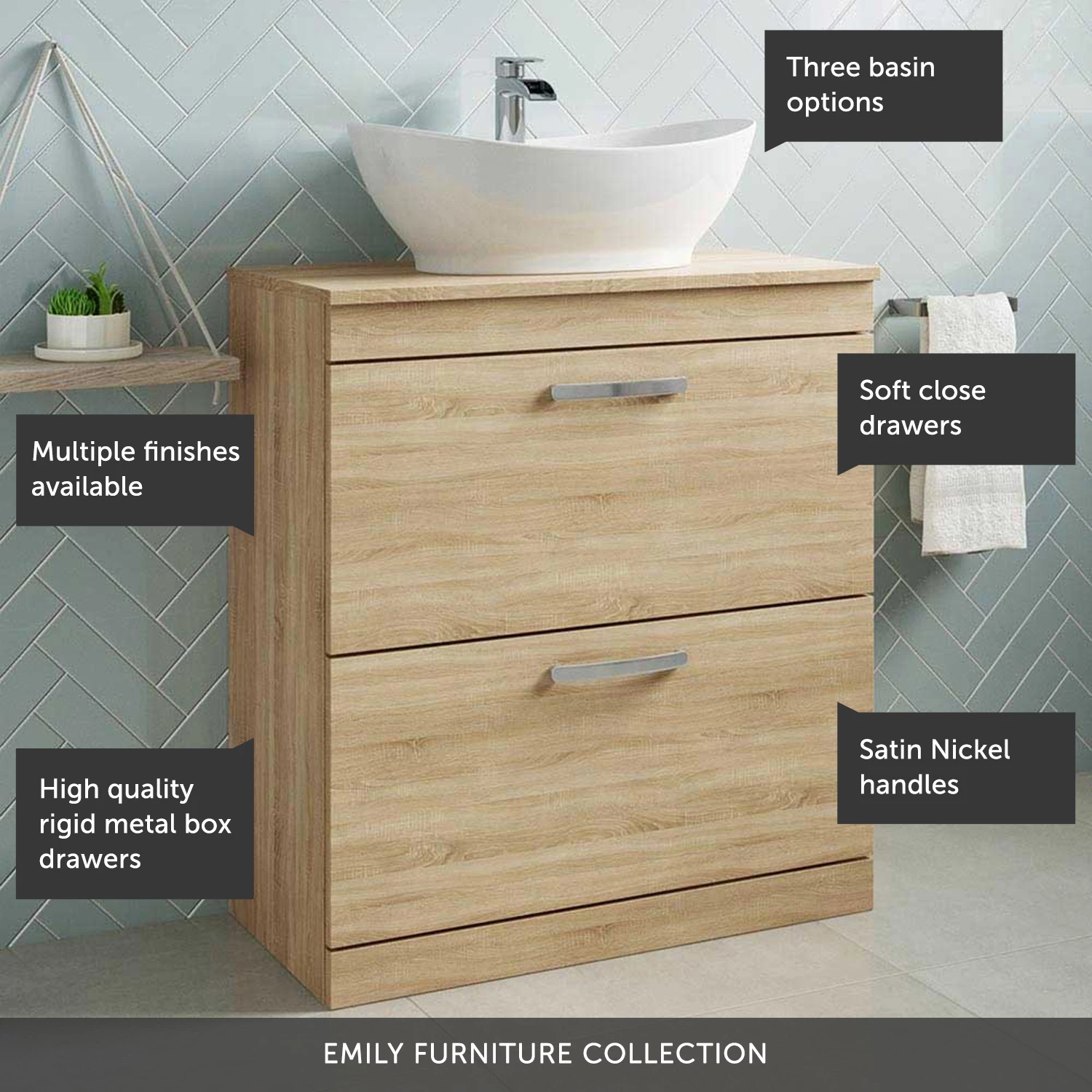 If you’re in search of true perfection (who isn’t?) then look no further, because the Emily 800mm floorstanding 2 drawer vanity unit and countertop is exactly what you seek! Made from FSC certified wood and with soft close drawers for peaceful storage, the Emily has everything you need; of course there’s also the range of finishes that are simply irresistible!