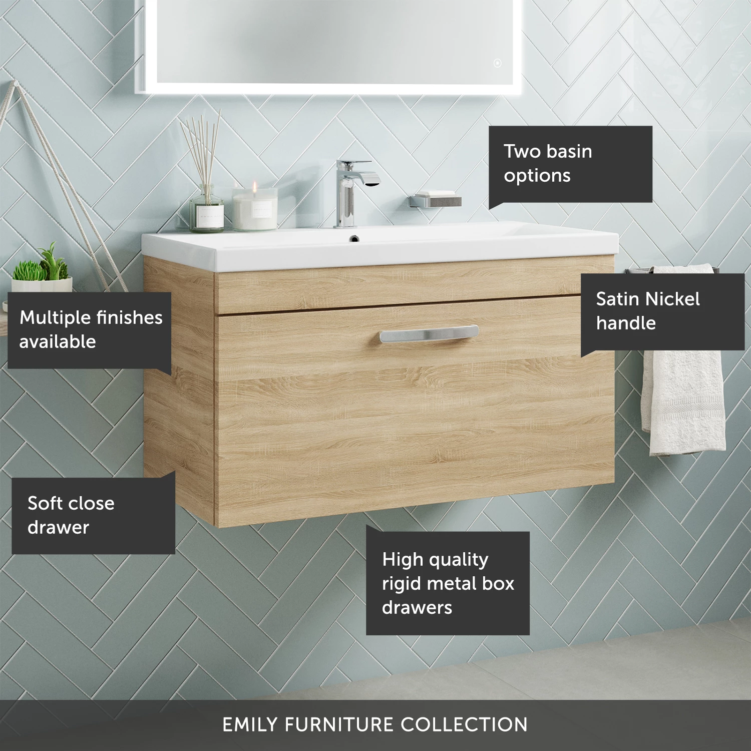 Choose either a minimalist or mid-edged basin for your own personal touch on this wonderful piece. If neither basin takes your fancy you can opt for a worktop only unit. The basin options are crafted from high quality vitreous china and come with one pre-drilled tap hole perfect for pairing with a basin mixer tap. The worktop comes undrilled to pair with a wall mounted or tall tap to compliment a countertop basin. This wall mounted Emily unit creates an illusion of extra space and looks fabulous whilst doing so – it’s simply a must have.