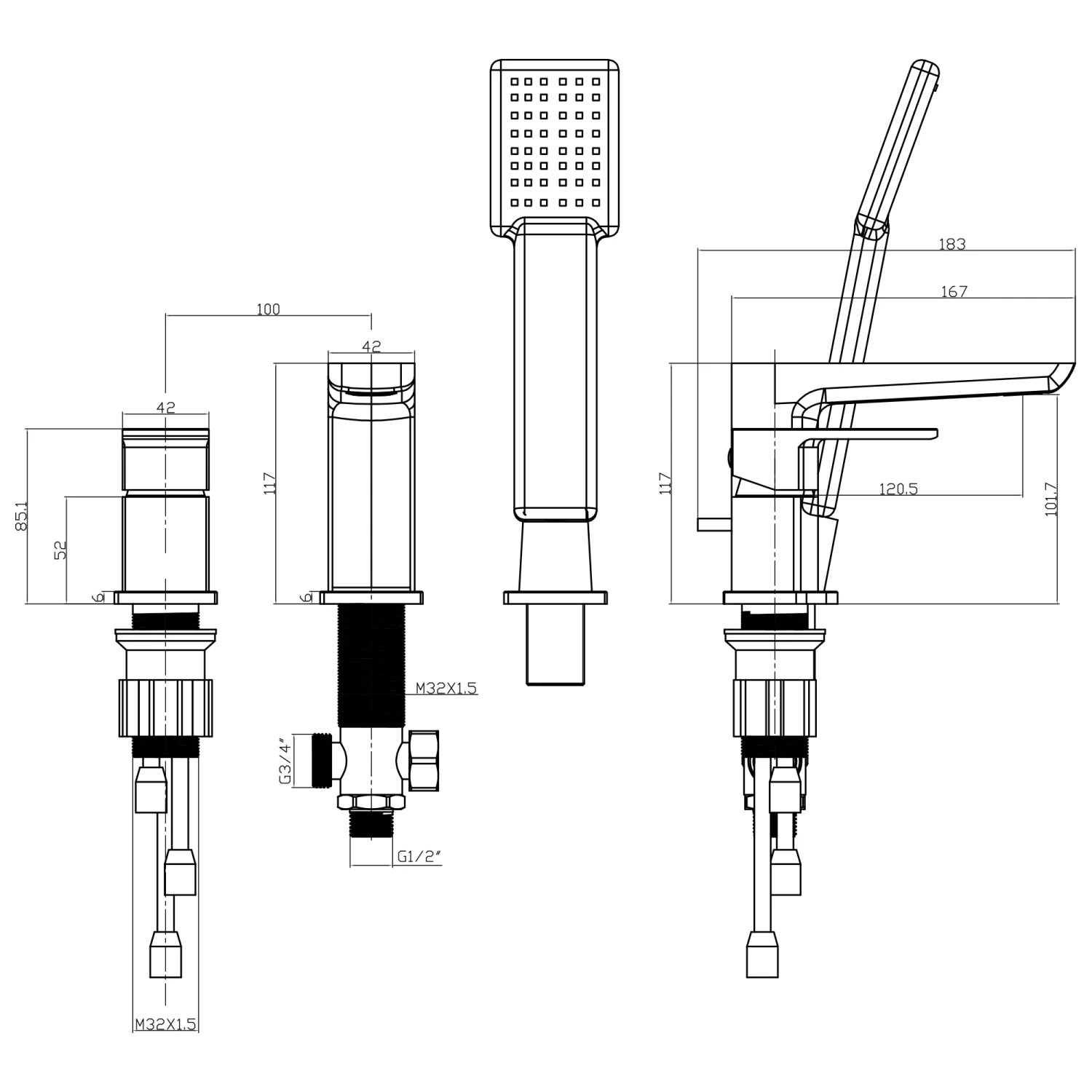 Harbour Status Chrome 3 Hole Bath Mixer With Pull Out Handset