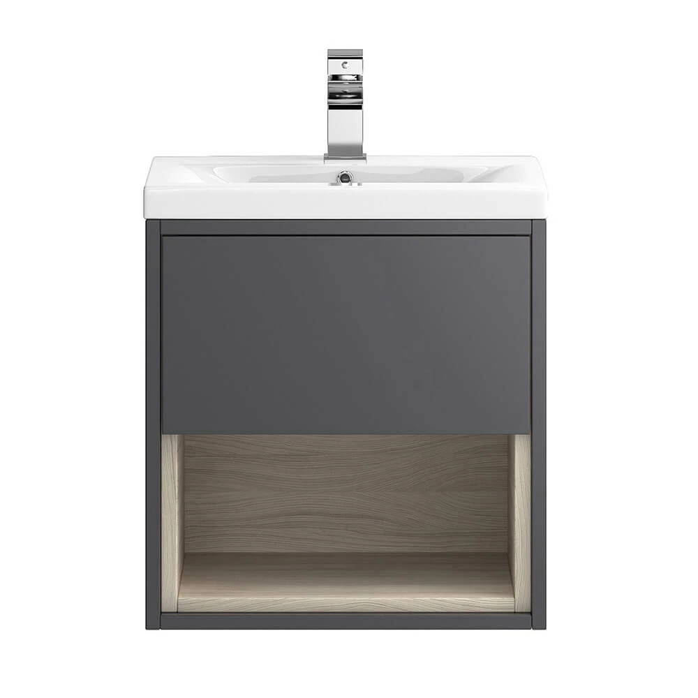 The Coast 500mm wall mounted vanity unit and basin features a high quality push to open soft close drawer and a modern, ard weraing and easy to clean ceramic basin.