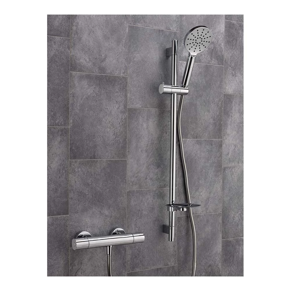 - Includes a bar shower valve, shower hose, slide rail and a push button operated shower handset